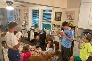 We sit and talk together for the third night in a row and there are two college students and two high school students and two elementary students and…