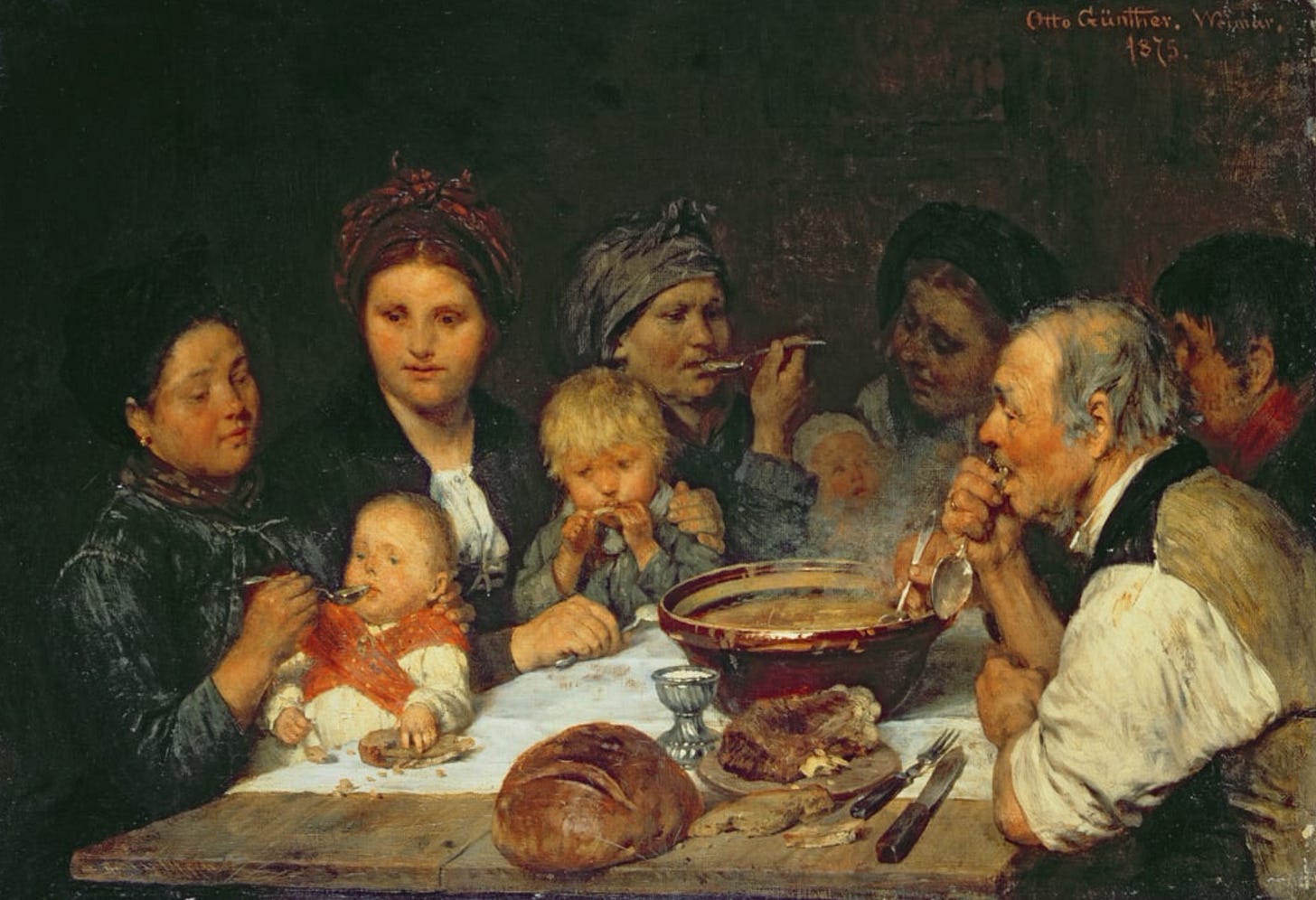 The plates clang together. We sing our prayer. Sixteen arms and sixteen hands begin reaching and gathering and eating.